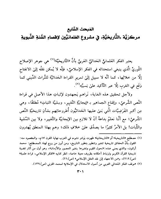 (¬١) مصطلح «التاريخية» أو «التاريخانية» ظهرت بوادر نشوءه في الغرب نهاية القرن ١٧ م، والمقصود منه: القول بأنَّ الحقائق تاريخية تتغير وتتطور بتطور التاريخ، ومن أبرز من روج لهذا المصطلح: محمد أركون، والذي يعني عنده: «تحول القِيم وتغيرها بتغير العصور والأزمان»، وهو أول من أثار قضية تاريخية القرآن الكريم وارتباط أحكامه بظروف معينة خاصة، انظر كتابيه «الفكر الإسلامي، قراءة علمية» (ص/٢١٢)، و «من الاجتهاد إلى نقد العقل الإسلامي» (ص/٢٦).