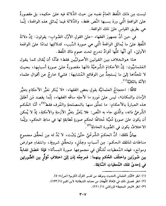 هذا هوالخلاف بين القولين الأصوليَّين فقط؛ فأمَّا أن يُقال كما يقول العَلمانيُّون: إنَّ الأحكامَ الشَّرعيَّةَ ذاتَها مقصورةٌ على صورةِ أسبابِها، بحيث لا تتَعدَّاها إلى ما يَستجِدُّ مِن الوقائع المُشابهة: فشيءٌ خارجٌ عن أقوالِ علماء الأمَّة بالكليَّة (¬١).