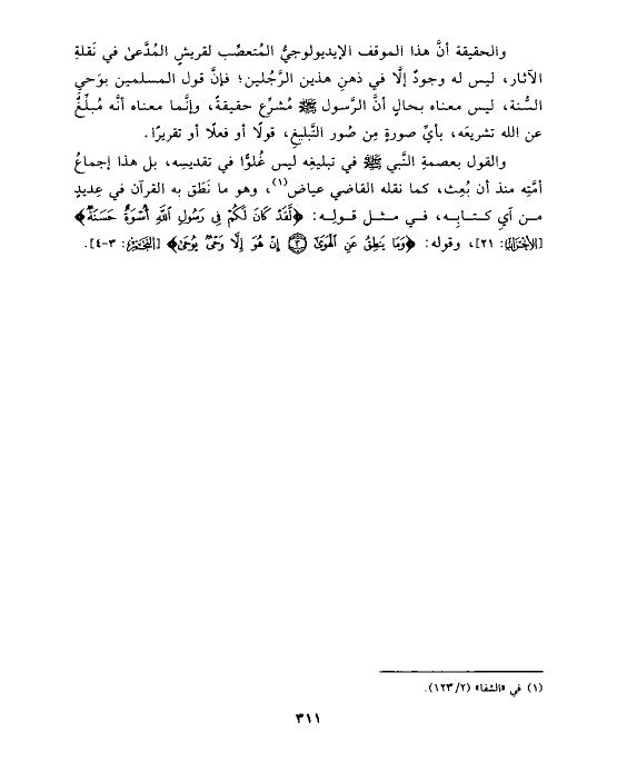 والقول بعصمةِ النَّبي صلى الله عليه وسلم في تبليغِه ليس غُلوًّا في تقديسِه، بل هذا إجماعُ أمَّتِه منذ أن بُعِث، كما نقله القاضي عياض (¬١)، وهو ما نَطَق به القرآن في عِديدٍ من آيِ كتابِه، في مثل قولِه: {لَقَدْ كَانَ لَكُمْ فِي رَسُولِ اللَّهِ أُسْوَةٌ حَسَنَةٌ} [الأحزاب: ٢١]، وقوله: {وَمَا يَنطِقُ عَنِ الْهَوَى (٣) إِنْ هُوَ إِلَاّ وَحْيٌ يُوحَى} [النجم: ٣ - ٤].