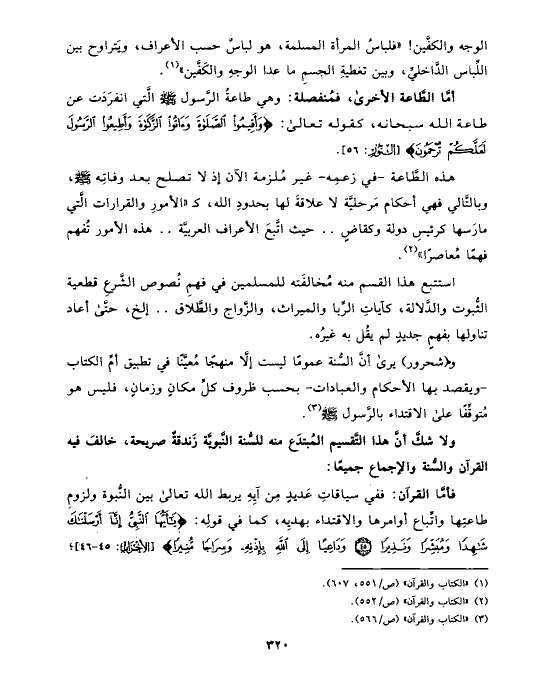 هذه الطَّاعة -في زعمِه- غير مُلزمة الآن إذ لا تصلح بعد وفاتِه صلى الله عليه وسلم، وبالتَّالي فهي أحكام مَرحليَّة لا علاقةَ لها بحدودِ الله، كـ «الأمورِ والقرارات الَّتي مارَسها كرئيسِ دولة وكقاضٍ .. حيث اتَّبعَ الأعراف العربيَّة .. هذه الأمور تُفهم فهمًا مُعاصرًا» (¬٢).