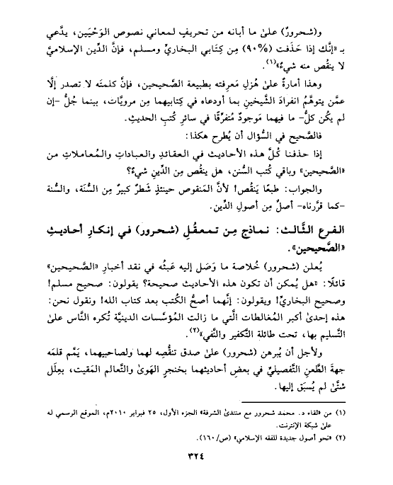 و (شحرورٌ) على ما أبانه من تحريفٍ لمعاني نصوص الوَحْيَين، يدَّعي بـ «إنَّك إذا حَذَفت (٩٠%) مِن كِتَابي البخاريِّ ومسلم، فإنَّ الدِّين الإسلاميَّ لا ينقُص منه شيءٌ» (¬١).