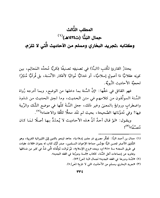 (¬١) جمال بن أحمد البنَّا: مُفكِّر مصري ذو جذور إسلامية، جاهد لينحو بالدين إلى الليبرالية الغربية، وهو الشَّقيق الأصغر لحسن البنَّا مؤسِّس جماعة الإخوان المسلمين، صدر أوَّل كتاب له بعنوان «ثلاث عقبات في طريق المجد» سنة ١٩٤٥ م، وبعده «روح الإسلام»، ثمَّ تَوالت مُؤلَّفاته الَّتي شذَّ في كثير من مسائلها وفتاويه عن إجماعات أهل السُّنة، ككتاب «السنة ودورُها في الفقه الجديد».