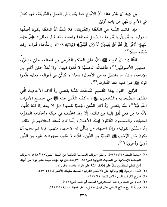 الرَّابع: القول بهذا التَّقسيم المُحدَث للسُّنة يقتضي ردَّ آلاف الأحاديث الَّتي نَقَلها الصَّحابة والتَّابعون رضي الله عنهم، وأئمَّة الدِّين عنه صلى الله عليه وسلم في جميع الأبواب الشَّرعيَّة (¬٤)، مِمَّا يقتضي رَدَّ أكثر السُّننِ الفِعليَّة نفسها! «بل لا يبعد إذا قلنا كلَّها، لأنَّه ما مِن فعلٍ نُقل إلينا مِن تلك، إلَّا وقد اختُلف في هيآته وأحكامِه المقوِّمة لحقيقتِه، والمسلمون النَّاقلون لِتِلكَ الأعمال، إنَّما كان مُستنَد اختلافهم في ذلك: إمَّا السُّنَن القوليَّة، وإمَّا اجتهاد مَن يتأتَّى له الاجتهاد منهم، فإذا لم يجِب أن تكون سُنن الرَّسولِ صلى الله عليه وسلم القوليَّة مِن الدِّين، فلَأن لا تكون مجهودات غيرِه مِن الدِّين أولى وأحرى!» (¬٥).
