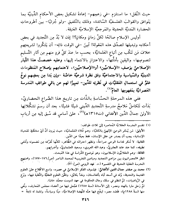 أوليس الإسلام صالحًا لكلِّ زمانٍ ومكانٍ؟! إذن لا بُدَّ مِن التَّجديد في بعضِ أحكامِه وتبديلها لتصدُق هذه المَقولة! آبينَ -في الوقت ذاتِه- أن يَتَنكَّروا لشريعتِهم خلافَ مَن تَنكَّب مِن أتباعِ العَلمانيَّة، بحسبِ ما عندَ كلِّ فردٍ منهم مِن آثارِ التَّسليمِ لنصوصِها، واليقينِ بأدلَّتها، والاعتزازِ بالانتماء إليها، وعليه خصصتُ هذا التَّيار الإصلاحيَّ بوَصفِ «الإسلاميِّين» أو «الإصلاحيِّين»، لاهتمامِهم بإصلاح المَنظومات الدينيَّة والسِّياسية والاجتماعيَّة وفق نظرة شرعيَّة خاصَّة -وإن بَدا مِن بعضِهم نوعُ غلوٍّ في استعمالِ العَقليَّاتِ في نَظرتِه للدِّين- تميِيزًا لهم عن باقي طوائفِ المَدرسة العَصرانيَّة بمَفهومِها العامِّ (¬١).