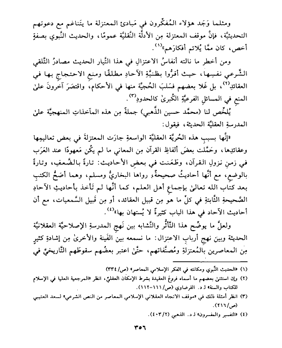 ومثلما وَجَد هؤلاء المُفكِّرون في مَبادئ المعتزلة ما يتَناغم مع دعوتهم التحديثيَّة، فإنَّ موقف المعتزلة مِن الأدلَّة النَّقليَّة عمومًا، والحديث النَّبوي بصفةٍ أخص، كان ممَّا يُلائم أفكارَهم» (¬١).