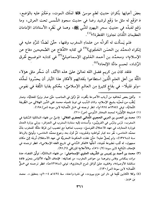 (¬٢) محمد بن الحسن بن العربي الحجوي الثَّعالبي الجعفري الفلالي: فاسيٌّ من فقهاء المالكية السَّلفية في المغرب، دَرَس ودَرَّس في القرويِّين، وأُسندت إليه سفارة المغرب في الجزائر، وولي وزارة العدل فوزارة المعارف في عهد الاحتلال الفرنسيِّ، وبسبب تماهيه مع تنصيب ابن عَرَفة ملكًا للمغرب بدَلَ محمَّد الخامس، نَفَر منه كبار مُواطنيه وهَجَروه، ثمَّ عُزل بعد رجوع محمَّد الخامس، وتُوفيَّ بالرباط سنة (ت ١٣٧٦)، ولم يُصلَّ عليه! حتَّى نقلت الحكومة المغربيَّة في عهد الاستقلال تُربتَه إلى مكان مجهول، له كُتب مَطبوعة مُفيدة، أجَلُّها «الفكر السَّامي في تاريخ الفقه الإسلامي»، انظر ترجمته في «إتحاف المُالع» لابن سودة (٢/ ٥٦٠)، و «الأعلام» للزركلي (٦/ ٩٦).