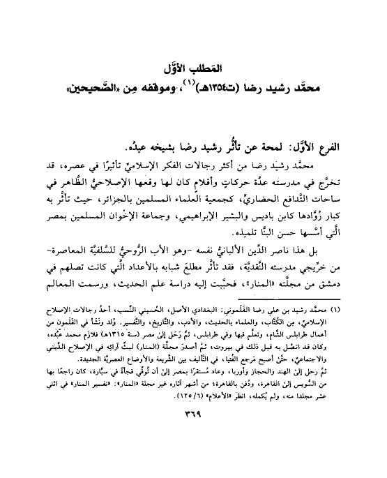 (¬١) محمَّد رشيد بن علي رضا القَلَموني: البغدادي الأصل، الحُسيني النَّسب، أحدُ رجالات الإصلاح الإسلاميِّ، مِن الكُتَّاب، والعلماء بالحديث، والأدب، والتَّاريخ، والتَّفسير. وُلد ونَشَأ في القَلَمون من أعمال طرابلس الشَّام، وتعلَّم فيها وفي طرابلس، ثمَّ رَحَل إلى مصر (سنة ١٣١٥ هـ) فلازَم محمد عبُده، وكان قد اتصَّل به قبل ذلك في بيروت، ثمَّ أصدرَ مجلَّة (المنار) لبثِّ آرائِه في الإصلاح الدِّيني والاجتماعيِّ، حتَّى أصبح مَرجع الفُتيا، في التَّأليف بين الشَّريعة والأوضاع العصريَّة الجديدة.