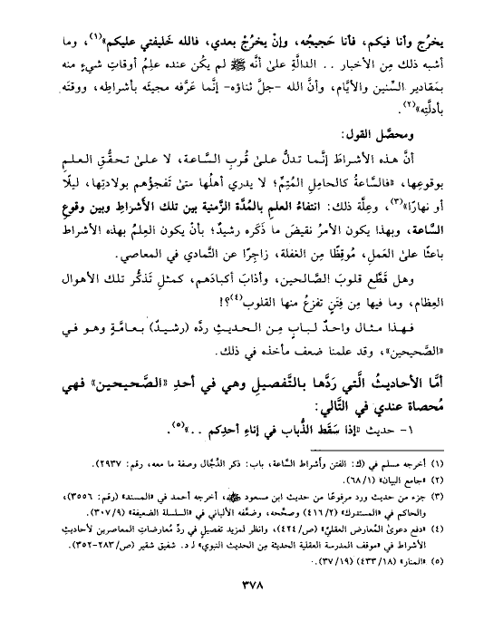 (¬٤) «دفع دعوى المُعارض العقليِّ» (ص/٤٢٤)، وانظر لمزيد تفصيلٍ في ردِّ مُعارضاتِ المعاصرين لأحاديثِ الأشراط في «موقف المدرسة العقلية الحديثة مِن الحديث النبوي» لـ د. شفيق شقير (ص/٢٨٣ - ٣٥٢).