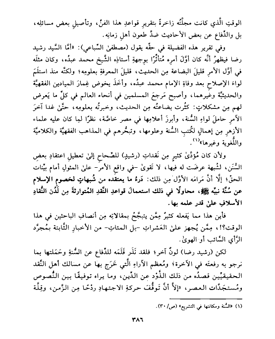 لكن (رشيد رضا) لونٌ آخر؛ فلقد نَذَر قَلَمَه للدِّفاع عن السُّنةِ وحَمَلتها بما نرجو به رفعتَه في الآخرة؛ ومُعظم الآراءِ الَّتي خَرَج بها عن مسالك أهل النَّقد الحقيقيِّين قصدُه من ذلك الذَّوْد عن الدِّين، وما يراه توفيقًا بين النُّصوص ومُستجَدَّات العصر، «إلَاّ أنَّ تَوقُّفَ حركةِ الاجتهادِ ردْحًا مِن الزَّمن، وقِلَّة