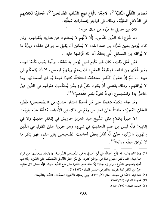 (¬١) وإن كان رشيد قد وَقَع أحيانًا في لَيِّ أعناقِ بعض النُّصوص الشَّرعية، والإبعادِ بمعانيها عن مُراد صاحبها، فقد رَفَض انتهاج هذا في مواطن كثيرة، بل بيَّن خطر التَّأويل المُتعسِّف على الدِّين، وتَلاعب أهلِه بنصوص الشَّرع، ولم يَره جائزًا إلَّا عند عدم القُدرة على دفع الشُّبه عنها، فإنَّه -على كل حالٍ- خيرٌ من الكفر كما يقول، وذلك في «تفسير المنار» (٣/ ١٧٤).