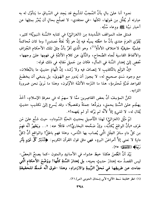 فمثل هذه المواقف الشَّديدة مِن (الغزاليِّ) في كتابه «السُّنة النبويَّة» كثير، يُقَوِّي العزمَ عندي بأنَّ ما خطَّته يمينُه فيه إنْ هو إلَّا نَفثةُ مَصدورٍ! وما كان مُحاكمةً عِلميَّة حقيقيَّة لاختلافِ الأدلَّةِ (¬١)؛ وهو الَّذي أقرَّ بأنَّ مِثلَ تلك الأحكام الجُزافِ والألفاظ القاسية تُجاه الصِّحاحِ، والنَّأيَ عن كلامِ الأئمَّةِ في فهمِها على وجهها، مُفضٍ إلى إهدارِ السُّنة في المآلِ، فكان مِن جَميلِ مَقالِه في ذلك قوله: