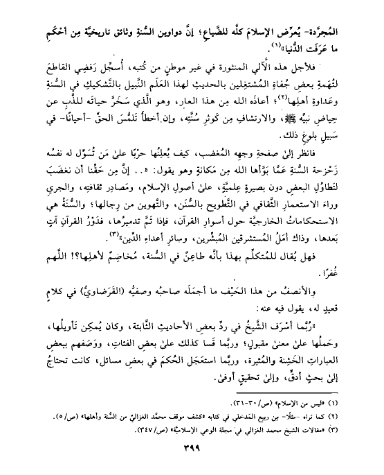 المُجرَّدة- يُعرِّض الإسلامَ كلَّه للضَّياعِ؛ إنَّ دواوين السُّنةِ وثائق تاريخيَّة مِن أحْكَمِ ما عَرَفَت الدُّنيا» (¬١).
