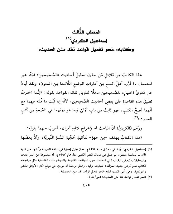 (¬١) إسماعيل الكردي: وُلد في دمشق سنة ١٩٦٤ م، حاز على إجازة في اللغة العربية وآدابها من كلية الآداب بجامعة دمشق، ثم عمل في مجال النشر الكتبي منذ عام ١٩٩٣ م، له مجموعة من المراجعات والتحقيقات لبعض الكتب التي تتحدث حول الديانات القديمة والموضوعات الفلسفية مثل مراجعته لكتاب نحو أرض جديدة لمؤلفه: كهارت توليه، وانظر ترجمة له موجزة في موقع (دار الأوائل للنشر والتوزيع)، وهي الَّتي طَبعت كتابه «نحو تفعيل قواعد نقد متن الحديث».