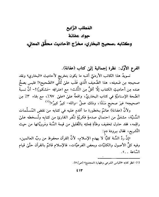 تسويدُ هذا الكاتب الأردنيِّ أشبه ما يكون بتخريجٍ لأحاديث «البخاري» ونقد صحيحِه مِن ضَعيفه، هذا الضَّعيف الَّذي غَلَب على ثُلثَي «الصَّحيح»! فليس يصحُّ عنده مِن أحاديثِ الكتاب إلَّا أقلُّ مِن الثُّلث؛ مع اعترافِه -مَشكورًا! - أنَّ نسبةَ الصِّحة الإسناديَّةِ في كتاب البخاريِّ، واقعةٌ على «على ٩٧ _، مع بقاء ٣ _ مِن «صحيحِه» غيرَ صحيحٍ سَنَدًا، وذلك عملٌ -والله- كبيرٌ كبيرٌ»! (¬١)