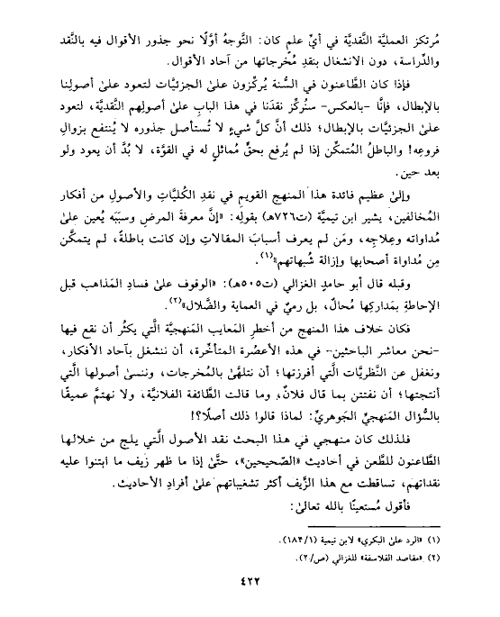 مُرتكز العمليَّة النَّقديَّة في أيِّ علمٍ كان: التَّوجهُ أوَّلًا نحو جذور الأقوال فيه بالنَّقد والدِّراسة، دون الانشغال بنقدِ مُخرجاتها من آحاد الأقوال.