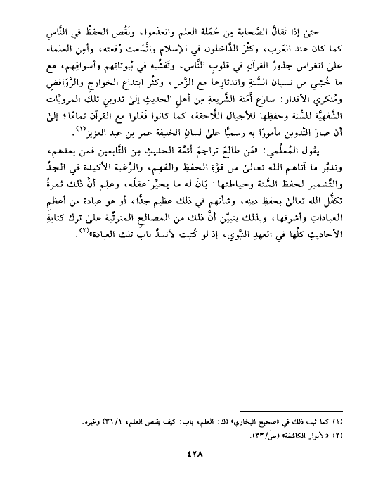 يقول المُعلِّمي: «مَن طالعَ تراجمَ أئمَّة الحديثِ مِن التَّابعين فمن بعدهم، وتدبَّر ما آتاهم الله تعالى من قوَّةِ الحفظِ والفهم، والرَّغبة الأكيدة في الجدِّ والتَّشمير لحفظ السُّنة وحياطتها: بَانَ له ما يحيِّر عقلَه، وعلِم أنَّ ذلك ثمرةُ تكفُّل الله تعالى بحفظِ دينِه، وشأنهم في ذلك عظيم جدًّا، أو هو عبادة من أعظمِ العباداتِ وأشرفها، وبذلك يتبيَّن أنَّ ذلك من المصالحِ المترتِّبة على ترك كتابةِ الأحاديثِ كلِّها في العهدِ النبَّوي، إذ لو كُتبت لانسدَّ باب تلك العبادة» (¬٢).