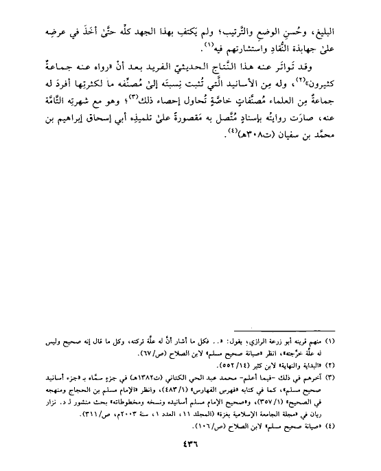 (¬٣) آخرهم في ذلك -فيما أعلم- محمد عبد الحي الكتاني (ت ١٣٨٢ هـ) في جزءٍ سمَّاه بـ «جزء أسانيد صحيح مسلم»، كما في كتابه «فهرس الفهارس» (١/ ٤٨٣)، وانظر «الإمام مسلم بن الحجاج ومنهجه في الصحيح» (١/ ٣٥٧)، و «صحيح الإمام مسلم أسانيده ونسخه ومخطوطاته» بحث منشور لـ د. نزار ريان في «مجلة الجامعة الإسلامية بغزة» (المجلد ١١، العدد ١، سنة ٢٠٠٣ م، ص/٣١١).