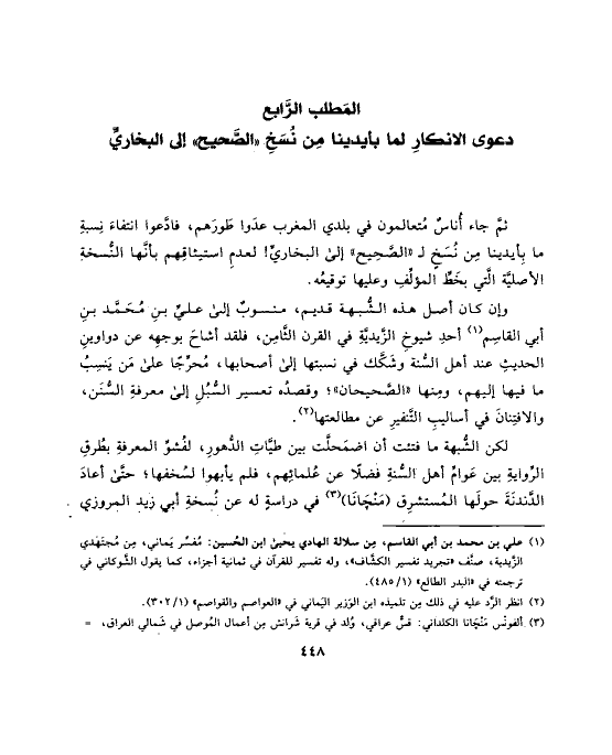 ثمَّ جاء أُناسٌ مُتعالمون في بلدي المغرب عدَوا طَورَهم، فادَّعوا انتفاءَ نِسبةِ ما بِأيدينا مِن نُسَخٍ لـ «الصَّحِيح» إلى البخاريِّ! لعدمِ استيثاقِهم بأنَّها النُّسخة الأصليَّة الَّتي بخَطِّ المؤلِّفِ وعليها توقيعُه.