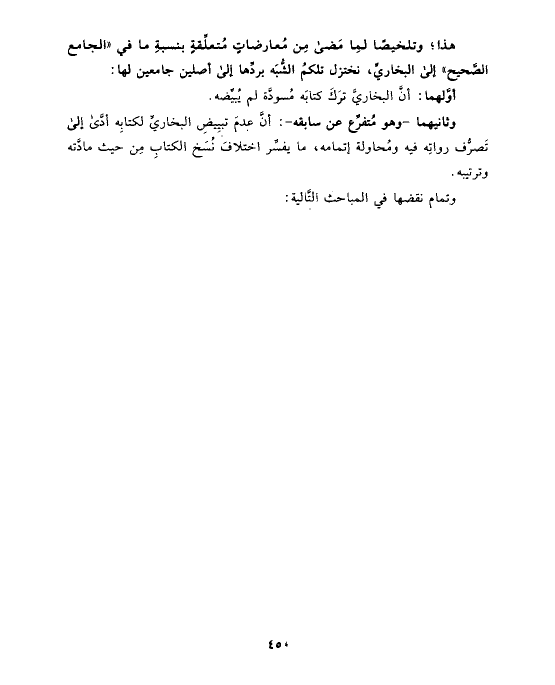 وثانيهما -وهو مُتفرِّع عن سابقه-: أنَّ عدمَ تبيِيضِ البخاريِّ لكتابِه أدَّى إلى تَصرُّف رواتِه فيه ومُحاولة إتمامه، ما يفسِّر اختلافَ نُسَخ الكتابِ مِن حيث مادَّته وترتيبه.