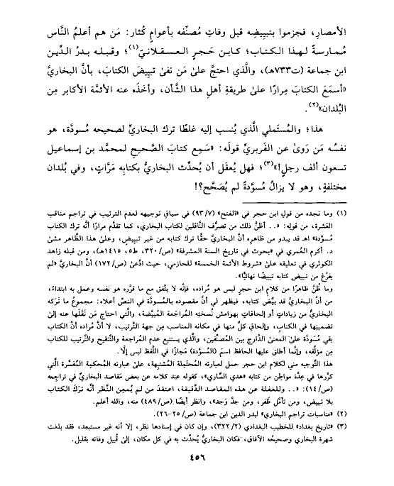 (¬١) وما نجده من قولِ ابن حجر في «الفتح» (٧/ ٩٣) في سياقِ توجيهه لعدم الترتيب في تراجم مناقب العَشرة، من قولِه: « .. أظنُّ ذلك من تصرُّف النَّاقلين لكتاب البخاري، كما تقدَّم مرارًا أنَّه ترك الكتاب مُسوَّدة» اهـ قد يبدو من ظاهرِه أنَّ البخاريَّ حقًّا ترك كتابه من غير تبيِيضٍ، وعلى هذا الظَّاهر مشى د. أكرم العُمري في «بحوث في تاريخ السنة المشرفة» (ص/٣٢٠، ط ٥، ١٤١٥ هـ)، ومن قبله زاهد الكوثري في تعليقه على «شروط الأئمة الخمسة» للحازمي، حيث ادَّعى (ص/١٧٢) أنَّ البخاريَّ «لم يفرُغ من تبييض كتابه تبييضًا نهائيًّا».