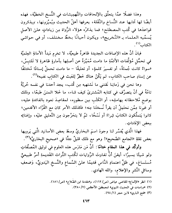 وهذا فضلًا عمَّا يتعلَّق بالإلحاقات والتَّهمِيشات في النُّسخ الخطيَّة، فهذه أيضًا لها آدابها عند النُّساخ والنَّقَلة، يعرفها أهلُ الحديث ويُميِّزونها، ويذكرون قواعدَها في كُتبِ المصطلح؛ فما يذكرُه هؤلاء الرُّواة مِن زياداتٍ على الأصلِ يُسمِّيه العلماء بـ «التَّخريج»، ويكون أحيانًا بخطِّ مختلف، أو في حواشي الكتاب (¬١).