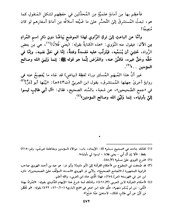 غير أنَّ هذا المُبهَم المُستَتِر وراءَ لفظِة (بياضٍ) قد جَاء ما يُفصِحُ عنه في روايةٍ أخرى جهلها المُستشرق، يقول ابن العربيِّ (ت ٥٤٣ هـ): «بَيَّنها أبو [ذرٍّ] (¬٣) في «جمعِ الصَّحيحين»، عن شعبة، بالسَّند الصحيح، فقال: «آل أبي طالِبٍ ليسوا إليَّ بأولياء، إنما وَليِّيَ الله وصالح المؤمنين» (¬٤).