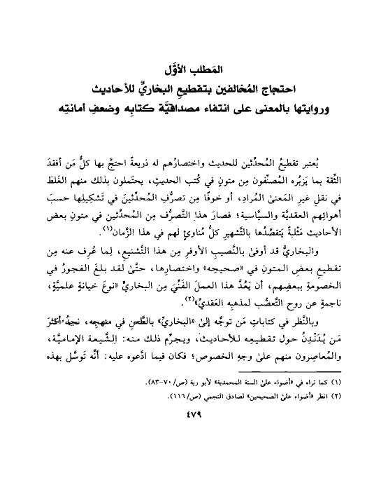 والبخاريُّ قد أوفى بالنَّصيبِ الأوفرِ مِن هذا التَّشنيعِ، لِما عُرِف عنه مِن تقطيعِ بعضِ المتونِ في «صحيحِه» واختصارِها، حتَّى لقد بلغَ الفجورُ في الخصومةِ ببعضِهم، أن يَعُدَّ هذا العملَ الفَنِّيَ مِن البخاريِّ «نوعَ خيانةٍ علميَّةٍ، ناجمةٍ عن روح التَّعصُّب لمذهبِه العَقديِّ» (¬٢).