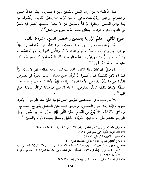 (¬٥) مع اتَّفاقِهم جميعًا على حُرمةِ روايةِ ما تَضمَّنته بطونُ الكُتُب بالمعنى، فليس لأحَدٍ أن يُغيِّر لفظَ شيءٍ مِن كتابٍ مُصَنَّفٍ ويُثبِتَ بَدَلَه فيه، لانتفاءِ المَشقَّة، انظر «مقدمة ابن الصَّلاح» (ص/٢١٤)، و «فتح المغيث» للسخاوي (٣/ ١٣٧).