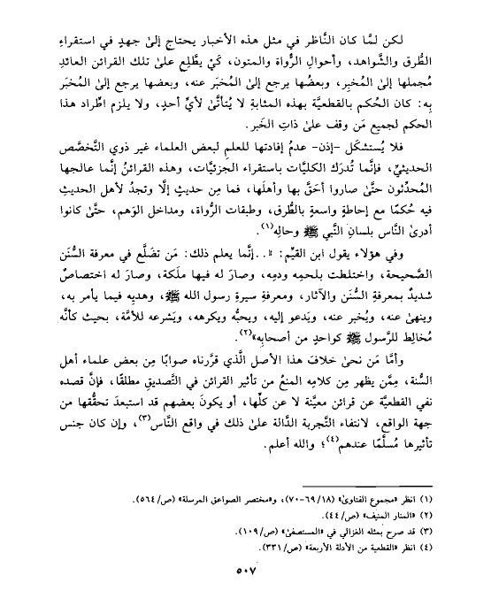 لكن لمَّا كان النَّاظر في مثل هذه الأخبار يحتاج إلى جهدٍ في استقراءِ الطُّرق والشَّواهد، وأحوالِ الرُّواة والمتون، كَيْ يطَّلِع على تلك القرائن العائدِ مُجملها إلى المُخبِر، وبعضُها يرجع إلى المُخبَر عنه، وبعضها يرجع إلى المُخبَر بِه: كان الحُكم بالقطعيَّة بهذه المثابةِ لا يُتأتَّى لأيِّ أحدٍ، ولا يلزم اطِّراد هذا الحكم لجميع مَن وقف على ذاتِ الخَبر.