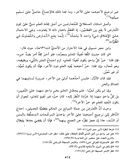 وأصل استثناءِ العسقلانيِّ للمُتعارضين من أصل إفادة العلم مَبنيٌّ على كونِ التَّعارض لا يقع بين القطعيَّين، إذ القطعُ باعتبارِ ذاتِه لا يَتفاوت، ونفي الاحتمال على الإطلاقِ شيءٌ واحد لا يَتَعدَّد (¬٢)، إنَّما يقع التَّعارض والتَّفاوتُ في الظَّنِيَّات (¬٣).