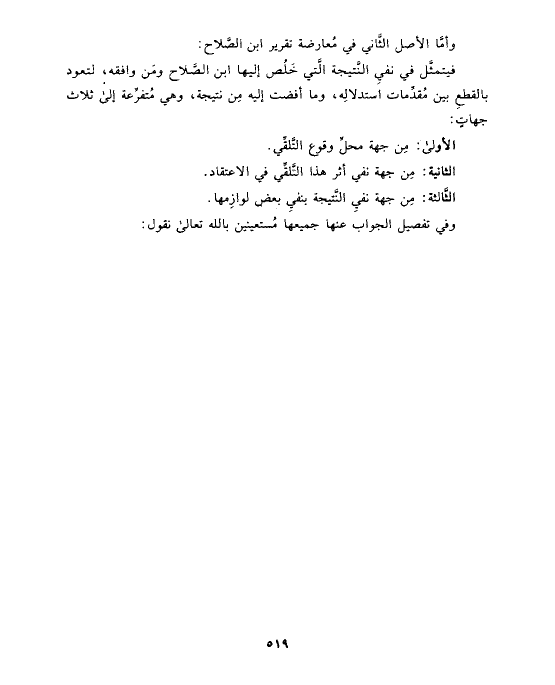 فيتمثَّل في نفيِ النَّتيجة الَّتي خَلُص إليها ابن الصَّلاح ومَن وافقه، لتعود بالقطعِ بين مُقدِّمات استدلالِه، وما أفضت إليه مِن نتيجة، وهي مُتفرِّعة إلى ثلاث جهاتٍ: