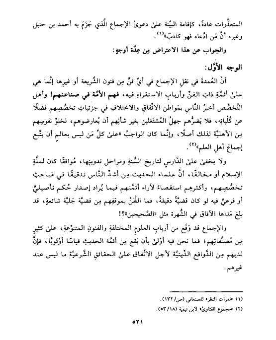 أنَّ العُمدةَ في نقلِ الإجماع في أيِّ فنٍّ مِن فنون الشَّريعة أو غيرِها إنَّما هي على أئمَّةِ ذاتِ الفنِّ وأربابِ الاستقراءِ فيه، فهم الأمَّة في صناعتهم! وأهل التَّخصُّص أخبرُ النَّاسِ بمَواطن الاتِّفاقِ والاختلافِ في جزئياتِ تخصُّصِهم فضلًا عن كُلِّياتِه، فلا يَضرُّهم جهلُ المُشتَغلين بغير شأنِهم أن يُعارضوهم، لخلوِّ نفوسِهم مِن الأهليَّة لذلك أصلًا، وإنَّما كان الواجبُ «على كلِّ مَن ليس بعالمٍ أن يتَّبع إجماعَ أهلِ العلم» (¬٢).
