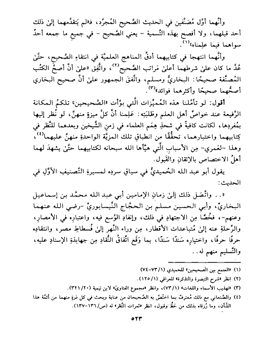 « .. واتَّصَل ذلك إلى زمانِ الإمامين أبي عبد الله محمَّد بن إسماعيل البخاريِّ، وأبي الحسين مسلم بن الحجَّاج النَّيسابوريِّ -رضي الله عنهما وعنهم-، فخُصَّا مِن الاجتهادِ في ذلك، وإنفادِ الوُسع فيه، واعتبارِه في الأمصارِ، والرِّحلةِ عنه إلى مُتباعدات الأقطار، مِن وراء النَّهر إلى فُسطاطِ مصر، وانتقادِه حرفًا حرفًا، واختيارِه سَندًا سَندًا، بما وَقَع اتِّفاقُ النُّقادِ مِن جهابذةِ الإسنادِ عليه، والتَّسليم منهم له ..