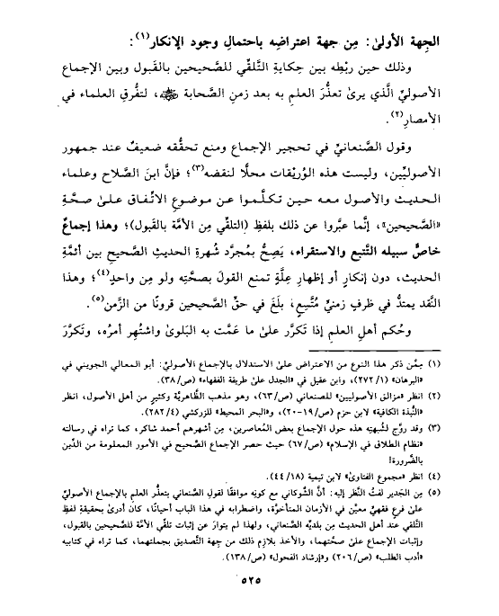 (¬٥) مِن الجَدير لفتُ النَّظر إليه: أنَّ الشَّوكاني مع كونِه موافقًا لقولِ الصَّنعاني بتعذُّر العلمِ بالإجماع الأصوليِّ على فرعٍ فقهيٍّ معيَّن في الأزمان المتأخرَّة، واضطرابه في هذا الباب أحيانًا، كان أدرى بحقيقةِ لفظِ التَّلقي عند أهل الحديث مِن بلديِّه الصَّنعاني، ولهذا لم يتوارَ عن إثبات تلقِّي الأمَّة للصَّحيحين بالقبول، وإثبات الإجماع على صحَّتهما، والأخذ بلازِم ذلك من جِهة التَّصديق بجملتهما، كما تراه في كتابيه «أدب الطلب» (ص/٢٠٦) و «إرشاد الفحول» (ص/١٣٨).