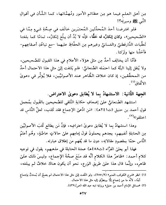 استشهد الصَّنعانيُّ على إضعافِ حكايةِ التَّلقي للصَّحيحين بالقَبول بمُجمل قولِ أحمد بن حنبل (ت ٢٤١ هـ): «مَن ادَّعى الإجماع فقد كَذب، لعلَّ النَّاس قد اختلفوا» (¬٢).