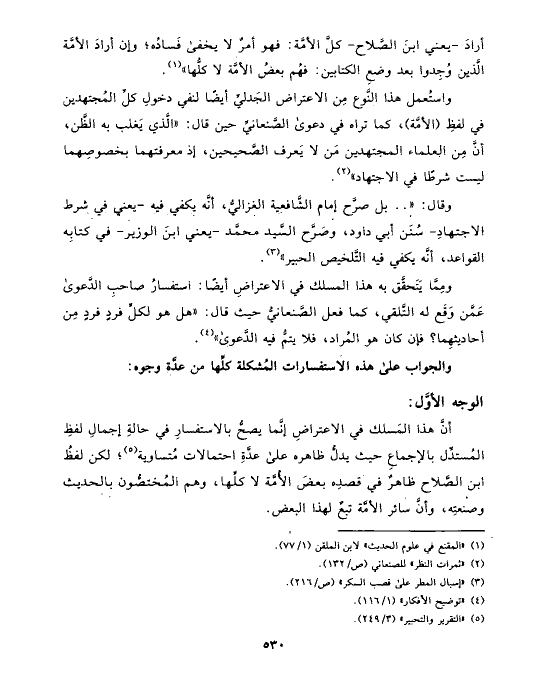 أنَّ هذا المَسلك في الاعتراضِ إنَّما يصحُّ بالاستفسارِ في حالةِ إجمالِ لفظِ المُستدِّل بالإجماعِ حيث يدلُّ ظاهره على عدَّةِ احتمالات مُتساوية (¬٥)؛ لكن لفظُ ابن الصَّلاح ظاهرٌ في قصدِه بعضَ الأُمَّة لا كلِّها، وهم المُختصُّون بالحديث وصنعتِه، وأنَّ سائر الأمَّة تبعٌ لهذا البعض.