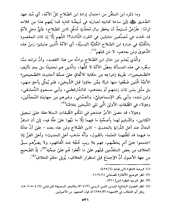 وما ذكره ابن الملقِّن من احتمالِ إرادة ابن الصَّلاح كلَّ الأمَّة، أي مُنذ عهد الصِّديق رضي الله عنه إلى ساعة كتابتِه لعبارتِه في مُبيضَّة كتابِه كما يُفهم هذا مِن كلامه لزامًا: ففَرْضٌ مُستبعدٌ أن يخطر ببالِ مُحدِّثٍ مُدقِّقٍ كابن الصَّلاح؛ فأيُّ دخلٍ لأمَّةٍ قد خَلت في مُصنَّفين حادِثين في القرن الثَّالث؟! اللَّهم إلَّا إن كان المقصود بالكُليَّةِ في عبارة ابن الصَّلاح الكُليَّةَ النِسبيَّة، أي الأمَّةَ الَّذين عايشوا زمنَ هذه الدَّعوى ومَن بعدهم، لا مَن قبلهم (¬١).