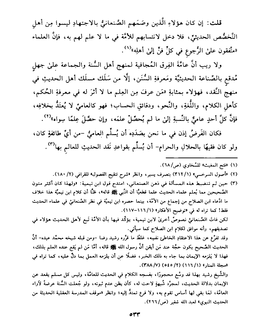 قلت: إن كان هؤلاءِ الَّذين وصَمَهم الصَّنعانيُّ بالاجتهادِ ليسوا مِن أهلِ التَّخصُّص الحديثيِّ، فلا دخل لانتسابهم للأمَّة في ما لا علم لهم به، فإنَّ العلماء «متَّفقون على الرُّجوعِ في كلِّ فنٍّ إلى أهلِه» (¬١).