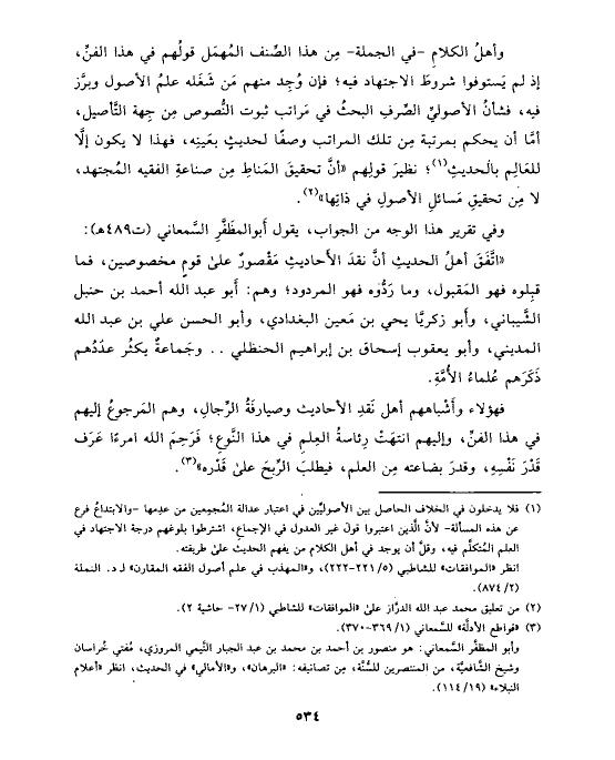 وأهلُ الكلامِ -في الجملة- مِن هذا الصِّنف المُهمَل قولُهم في هذا الفنِّ، إذ لم يَستوفوا شروطَ الاجتهاد فيه؛ فإن وُجِد منهم مَن شَغَله علمُ الأصول وبرَّز فيه، فشأنُ الأصوليِّ الصِّرفِ البحثُ في مَراتب ثبوت النُّصوص مِن جِهة التَّأصيل، أمَّا أن يحكم بمرتبة مِن تلك المراتب وصفًا لحديثٍ بعَينِه، فهذا لا يكون إلَّا للعَالِم بالحديثِ (¬١)؛ نظيرَ قولِهم «أنَّ تحقيقَ المَناطِ مِن صناعةِ الفقيه المُجتهد، لا مِن تحقيقِ مَسائلِ الأصولِ في ذاتِها» (¬٢).