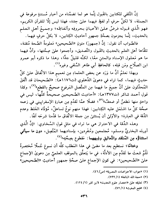 إنَّ التَّلقي للكتابين بالقَبول إنَّما هو لما تضمَّناه من أخبار مُسندةٍ مرفوعة في الجملة، لا لكلِّ حرفٍ أو لفظٍ فيهما على حِدة، فهذا ليس إلَّا للقرآنِ الكريم، فهو الَّذي قبوله فرضٌ على الأعيانِ بحروفِه وألفاظِه؛ وجميعُ أهلِ العلمِ بالحديثِ، إنَّما يجزمون بصحَّةِ جمهورِ أحاديثِ الكِتابين، لا بكلِّ حرفٍ فيهما.