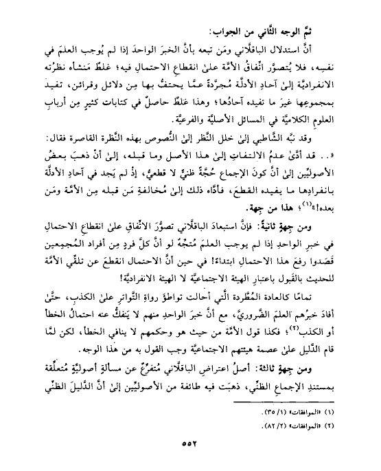 أنَّ استدلال الباقلَّاني ومَن تبعه بأنَّ الخبرَ الواحدَ إذا لم يُوجب العلمَ في نفسِه، فلا يُتصوَّر اتِّفاقُ الأمَّة على انقطاعِ الاحتمالِ فيه؛ غلطٌ مَنشأه نظرُته الانفراديَّة إلى آحادِ الأدلَّة مُجرَّدةً عمَّا يحتفُّ بها مِن دلائل وقرائن، تفيد بمجموعِها غيرَ ما تفيده آحادُها؛ وهذا غلطٌ حاصلٌ في كتابات كثيرٍ مِن أربابِ العلومِ الكلاميَّة في المسائل الأصليَّة والفرعيَّة.