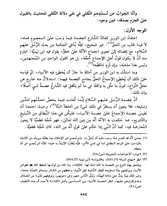 اعتقادُ ابن الوزيرِ كفالةَ الشَّارع العِصمة فيما وَجبَ على المعصومِ فعله، لا فيما طَلب مِن الحقِّ (¬١): غير صَحيح، فإنَّه يُنافي الحِكمة مِن بعثِ الرُّسُل عليهم السَّلام، مع إفضائه إلى تجويز اجتماعِ الأمَّة على خطأٍ، يقول فيه ابن تيميَّة: «يلزم منه أنْ لا يكون قولُ أهلِ الإجماع حُجَّة، بل هو كقولِ الواحدِ مِن المُجتهدين، وليس هذا مذهبَه، وإن لَزِم تناقضُه» (¬٢).
