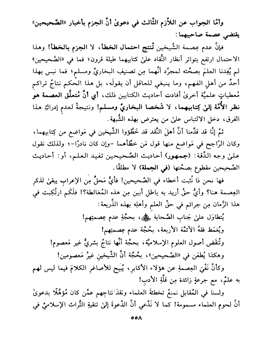 فها نحن ذا نُثبت أخطاء في الصَّحيحين! فأيُّ مَحلٍّ مِن الإعرابِ يبقى لذكرِ العِصمة هنا؟ وأيُّ حقِّ أريد به باطل أبين مِن هذه المُغالطة؟! فلَكَم ارتُكِبت في هذا الزَّمان مِن جرائم في حقِّ العلمِ وأهلِه بهذه الذَّريعة: