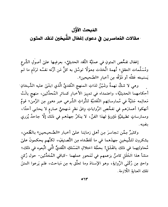 وكثيرٌ مِمَّن تجاسرَ مِن أهل زمانِنا على أخبار «الصَّحيحين» بالطَّعنِ، يشكرون للشَّيخينِ جهدَهما في ما تَقصَّداه مِن التَّصنيفِ، لكنَّهم يحكمونَ على مُحاولتِهما في ذلك بالفَشَلِ! بحجَّة اختلالِ المَسْلكِ النَّقديِّ الَّتي اتَّبعوه في ذلك؛ منشأ هذا الخَلَلِ كامنٌ بزعمهم في تَمَحورِ عملهما -كباقي المُحَدِّثين- حول رُكنٍ واحدٍ مِن رُكْنَي الرِّوايةِ، وهو الإسنادَ وما تعلَّق به مِن مَباحث، فلم يَرعوا المتنَ تلك العنايةِ اللَّازمة.