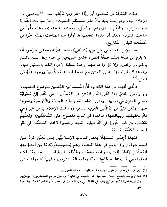 فالَّذي أفهمه من هذا الكلام، أنَّ المُستشرقين المُعتنين بموضوع الحديث، يريدون مِن إطلاقِ هذا النَّفيِ للنَّظر المَتنيِّ عن المُحدِّثين: نفي النَّظر إلى مَعقوليَّة معاني المتون في نفسها، ومدى انتفاء المُعارضات الحِسيَّة والتَّاريخية ونحوها عنها؛ ولكن كثيرٌ من المُثقَّفين العرب انساقوا وراء تلك الإطلاقاتِ مِن غير وَعيٍ تامٍّ بحقيقتها وسِياقاتها، فوقعوا في كذبٍ مفضوح على المُحدِّثين؛ ولعلَّهم تقصَّدوه من باب التَّهويلِ في التَّوصيفِ! تشنيعًا وتصغيرًا لأقدار المُحدِّثين في نظرِ النُّخَب المُثقَّفة المُسلِمَة.