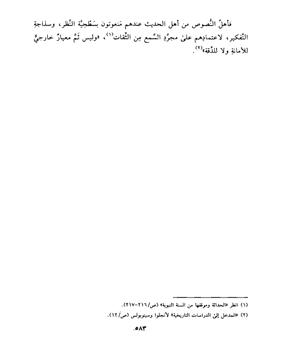 فأهلُ النُّصوص من أهل الحديث عندهم مَنعوتون بسَطْحِيَّة النَّظر، وسذاجةِ التَّفكير، لاعتمادِهم على مجرَّدِ السَّمع مِن الثِّقات (¬١)، «وليس ثَمَّ معيارٌ خارجيٌّ للأمانةِ ولا للدِّقة» (¬٢).