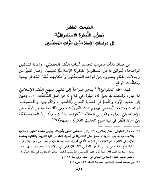 فهذا (طه العلوانيَّ) (¬١) يدعو صراحةً إلى تغيِير منهجِ النَّقد الإسلاميِّ للأخبار، واستحداثِ بديلٍ له، فيقول في كلامٍ له عن عَملِ المُحَدِّث: « .. اِنتهى إلى تقليدِ الرُّواة والنَّقلةِ في قضايا الجرح والتَّعديل، والتَّوثيق، والتَّضعيف، أو تقليد ومتابعة الرُّواة في فهمِهم لتلك المَرويَّات، وفي ذلك ما فيه مِن تَوقُّف عن الإضافةِ إلى العلم، وتكريسِ العقليَّة السُّكونية؛ ولذلك، فإنَّا نرى الحاجة مُلحَّةً إلى إعادةِ النَّظر في بِنية علومِ الحديثِ الفكريَّةِ والمنهجيَّةِ» (¬٢).