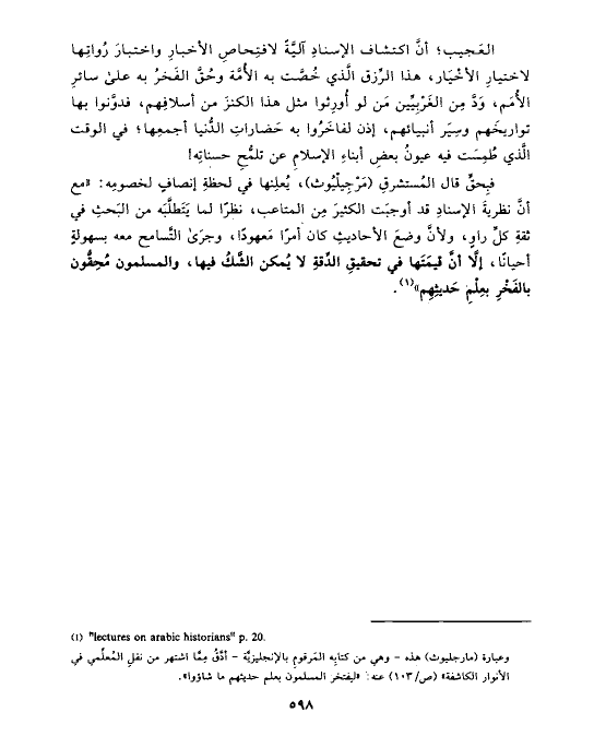 وعبارة (مارجليوث) هذه - وهي من كتابِه المَرقومِ بالإنجليزيَّة - أدَّقُ مِمَّا اشتهر من نقلِ المُعلِّمي في الأنوار الكاشفة» (ص/١٠٣) عنه: «ليفتخر المسلمون بعلم حديثهم ما شاؤوا».