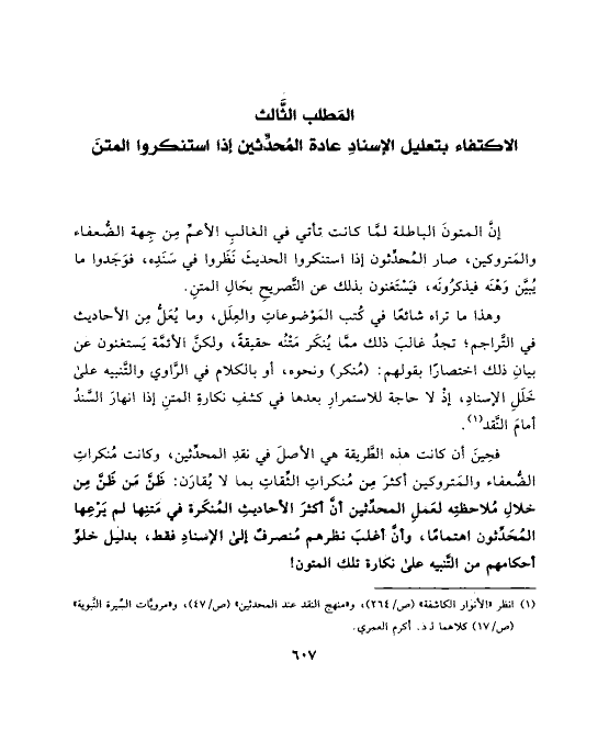 فحِينَ أن كانت هذه الطَّريقة هي الأصلَ في نقدِ المحدِّثين، وكانت مُنكراتِ الضُّعفاء والمَتروكين أكثرَ مِن مُنكراتِ الثِّقاتِ بما لا يُقارَن: ظَنَّ مَن ظَنَّ مِن خلالِ مُلاحظتِه لعَملِ المحدِّثين أنَّ أكثرَ الأحاديثِ المُنكَرة في مَتنِها لم يَرْعِها المُحَدِّثون اهتمامًا، وأنَّ أغلبَ نظرهم مُنصرفٌ إلى الإسنادِ فقط، بدليل خلوِّ أحكامهم من التَّنبيه على نكارة تلك المتون!