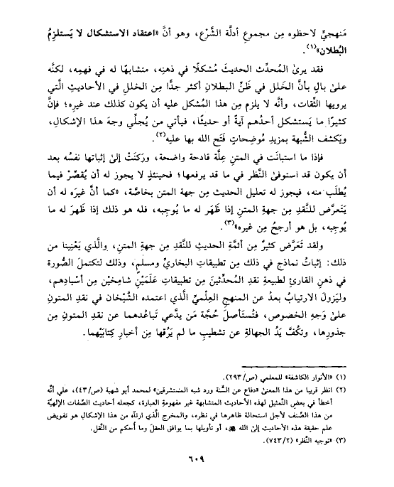 (¬٢) انظر قريبا من هذا المعنى «دفاع عن السُّنة ورد شبه المستشرقين» لمحمد أبو شهبة (ص/٤٣)، علي أنَّه أخطأ في بعضِ التَّمثيل لهذه الأحاديث المتشابهة غير مفهومةِ العبارة، كجعله أحاديث الصِّفات الإلهيَّة من هذا الصِّنف لأجل استحالة ظاهرها في نظره، والمخرج الَّذي ارتآه من هذا الإشكالِ هو تفويض علم حقيقة هذه الأحاديث إلى الله عز وجل، أو تأويلها بما يوافق العقلَ وما أُحكم من النَّقل.